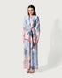 بليزر ساتان مطبوع مع حزام. يتميز بياقة مطوية وأكمام طويلة وتصميم ملفوف مع حزام من نفس القماش لخصر مشدود. مصمم من قماش ساتان انسيابي بطبعة زهور بدرجات باستيل من الأزرق والوردي والليلكي. أنيق ومتعدد الاستخدامات، مثالي لإطلالات من الصباح إلى المساء.