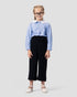 بنطلون واسع الساق باللون الأزرق الداكن مع خصر مرتفع وتفاصيل ربطة جانبية.